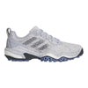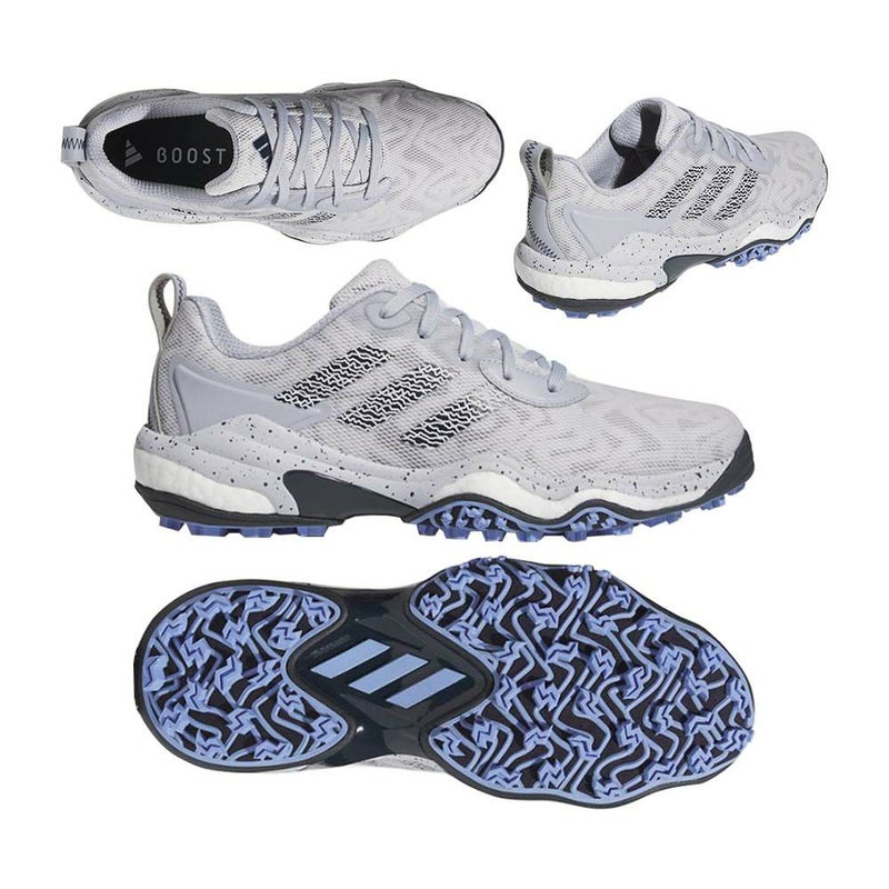 日本史上でもっとも売れたスパイクレスシューズ、コードカオスシリーズが2年ぶりにフルモデルチェンジ。adidas最高峰のツアースパイクレスパフォーマンスを追求して開発されたコードカオス25は前作のコードカオス22の性能全てが更にエレベートされている。最大の特徴は前作から更に約40%も向上したグリップ力。全く新しい、進化したTWISTGRIPは、前作アウトソールの一部からソール面の100%を覆う構造になり、ラグ(凹凸)の形状・個数・配置の全てを見直し、コードカオス特有の地面と足裏全面が一体化するような特性に加えて地面に鋭く噛み付く様なグリップ要素をプラス。アディダスゴルフ史上、トップクラスのグリップ性能をスパイクレスで実現。ミッドソールは、独自の高性能クッショニング素材であるBOOSTとシリーズ初搭載となるLIGHTSTRIKEの2種類ハイブリッドした構造を採用。従来コードカオスの快適なクッショニングをそのままに、スイング時には前作にないパワフルな反発と安定性の両方をもたらし、メリハリ感の強い性能を実現。アッパーには新感覚の履き心地と性能を実現する新素材、うどんニットアッパーを採用。その名の通り、うどんのような形状をしたモチモチとした繊維素材がアッパーの内部にサンドイッチ状に挟まれている構造によって、アッパー内部に一般的なニットより空気を多く含み、枕が内蔵されているかのようなソフトで快適な履き心地をもたらす。加えて、一定方向には優れた伸縮性がありながら、逆方向には伸びないという特殊な性質によって、前作より歩行時などの動きやすさや快適性がアップしながらも、一定方向には伸びないことでサポート力も同時に向上。全面的に薄いPUフィルムで覆い、アッパーの伸びの調整をしながら、高い防水性も誇る。BOAモデルは前作同様、直足BOAラップを採用しつつ、アッパー外部に合成皮革素材のパワーケージでスイング時に最も伸びる箇所を大胆にサポートし安定性が大幅に向上。ファスナーの開け閉めによる性能差もより顕著に感じられる様に改良。ファスナー位置もサイドに移動したことで安定性がアップし、止水ファスナーによって防水性も向上。25.5cm 重量:約425g ツアーパフォーマンスラスト(EE相当)。