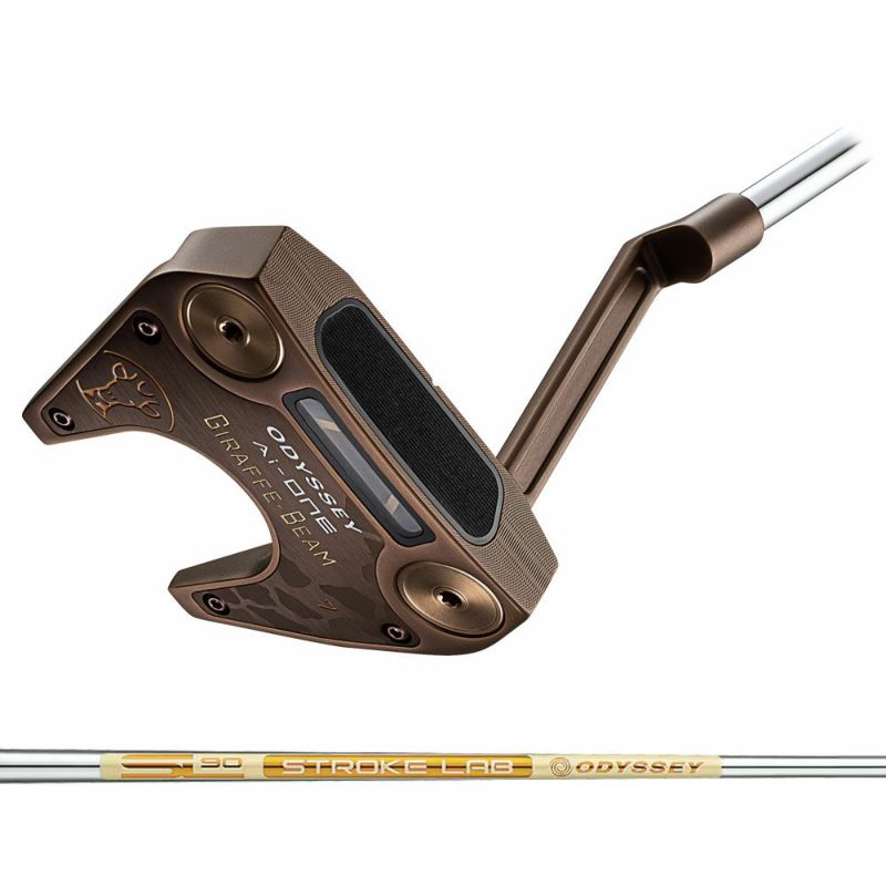 「Ai-ONE GIRAFFE-BEAMパター」は前作のGIRAFFE-BEAMパター同様、随所にキリンをイメージさせるデザインが施されているところも注目に値します。ロゴにはキリンのイラストを採用し、ボディの大部分にはキリンの身体の色に近いカッパー仕上げを導入。ソールにはレーザーでキリンの柄を描き、グリップには前作と違うODYSSEYロゴ、ヘッドカバーには今回贅沢にも刺?によってキリンの模様が施されています。ソール前方のトウとヒールには、それぞれ約10gのウェイト(#2のみ約15g)も搭載。ヘッドラインアップには#2、DW、#7、JAILBIRD MINIの4種類が用意されており、いずれにも、すべてスチールでできているSTROKE LAB 90シャフトが組み合わされています。
