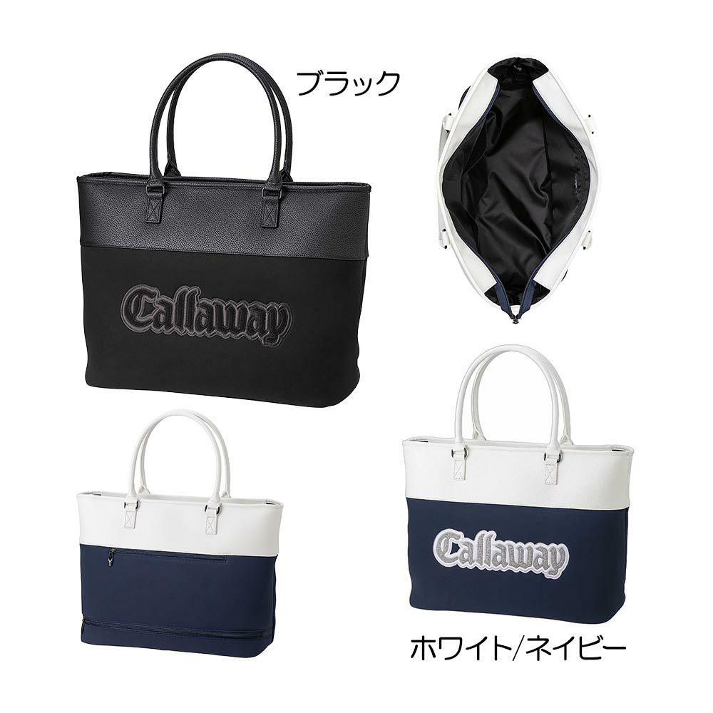 Callawayブランドロゴのフォントを使用したデザインロゴが特徴のトートバッグ。高級感のあるPU生地とマットな生地とのコンビネーションは魅力のひとつ。収納は、メインポケット、背面ファスナーポケットとシューズポケット、内側仕分け用ポケットが3つの、計6つ。メイン収納内側は、ファスナーポケットと小物用ポケットがあり、荷物を仕分けしわけやすい設計。背面には、小物用のファスナーポケットとシューズポケットを配置。内側ポケットは、2分割の差し込みポケットとファスナーポケット。天面はファスナー仕様で、ゴルフシーンでの使いやすさを考えた設計。ハンドルは肩掛け可能な長さで設定可能。