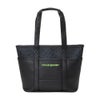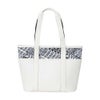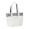 レザーライクな合皮と高密度ポリエステル生地を組み合わせたトートバッグ。同系色の組み合わせで総柄プリントも馴染み良く使いやすいデザイン。開口部ファスナー付き。中国製。