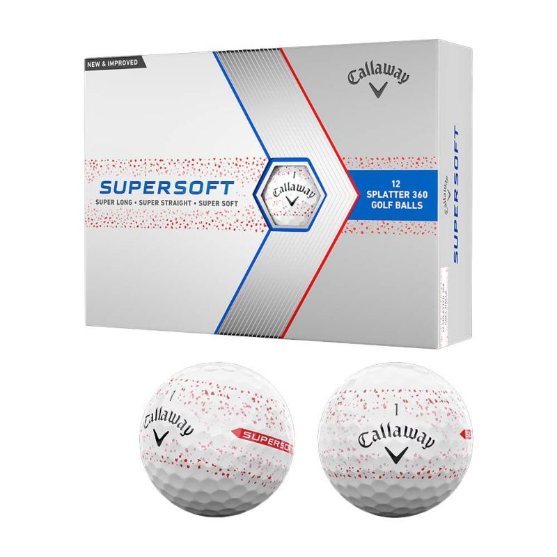 散らばった点が、線に変わる。アライメントにまた新たなタイプが誕生『SUPERSOFT SPLATTER 360』。【Features&Benefits】■SPLATTER」の意味は、「飛び散ること」「点在するもの」。キャロウェイのボールではこれまで、ターゲットに向けて正確にセットしやすくしたり、グリーン上でのボールの転がりを見やすくしたりするべく、TRUVIS、TRIPLE TRACK、360° TRIPLE TRACK、TRUTRACK、360 FADEなど、さまざまなデザイン、アライメントをカバー上に搭載してきました。今回登場の「SPLATTER 360」は、それらとも少し異なる、新たなスタイルのアライメントです。カバーには、ボールの1周360度にわたって、色のついた細かな点が、スプレーされたような状態で散りばめられています。名前にあるSPLATTERは、「飛び散ること」「点在するもの」といった意味の英語です。■ 主張の強いカラー、デザインが苦手な人にも使いやすい。この多くの細かな点は、静止しているときには、その点が点在して見える一方、ボールがねじれのないきれいな回転をすると、線になって見えるようになっています。ゴルファーのなかには、アドレス時に強く目に入ってくるカラーやデザインのものは気になってしまうという人も存在しますが、「SPLATTER 360」の場合、アドレス時にはあまり主張せず、転がったときには回転がしっかり見えるスタイルに仕上がっています。また、色のついた細かな点は、幅広い帯のような状態に描かれているため、ターゲットに向けて正確にセットする機能も持ち合わせています。スプレーされたようなデザインのため、線をイメージしづらいという場合は、「SPLATTER 360」の中央に配置されている、「SUPERSOFT」のロゴが入った矢印状のラインを利用することもできます。「SPLATTER 360」のカラーには、ブルーとレッドの2色(ボールはホワイト)をラインアップしており、いずれのカラーもグレーの点と組み合わされたものとなっています。■柔らかく反発力も強いコアで、大きな飛距離を実現。今回「SPLATTER 360」が搭載されたのは、2023年にリニューアルされた2ピースボール、「SUPERSOFTボール」です。このボールには、2022年モデルのCHROME SOFTシリーズや、2023年モデルのE・R・C SOFTボールでも採用のハイパーエラスティック・ソフトファスト・コアが搭載されています。非常にソフトで、かつ反発性能が高いコアとなっており、ロングゲームではこれまで以上の高いボールスピードと低スピンで、大きな飛距離を稼ぎ出します。■ハイブリッドカバーで、飛びとグリーン周りでのスピンを両立。ハイパーエラスティック・ソフトファスト・コアは、従来のアイオノマー製カバーが持つ課題を解決したハイブリッドカバーによって覆われています。アイオノマーは、高弾性による高い反発性と、摩擦が少ないことによるスピン抑制の効果が、ロングゲームにおいて威力を発揮していましたが、同様にグリーン周りでもスピンレスとなってしまう難点がありました。しかし、ハイブリッドカバーは高硬度のアイオノマーと低硬度のアイオノマーにパラロイド?という耐衝撃強化剤を配合したものとなっており、弾力性がありながら、柔軟性、耐久性の高さも実現。ロングゲームでは低スピン、高初速、高打ち出しを可能にしながら、ショートゲームにおいても高いスピン性能と心地良いフィーリングをもたらすものとなっています。グリップ・ウレタンコーティングも、止まる性能に大きく貢献。■ハイブリッドカバーの上には、2023年のE・R・C SOFTボールにも搭載された、グリップ・ウレタンコーティングシステムが採用されています。このコーティングを施すことにより、アプローチショットでのスピン量が増加。グリーン周りにおけるパフォーマンスも格段にアップしています。