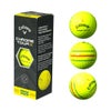 ソフトな打感とトータルパフォーマンスでスコアアップに貢献。『CHROME SOFTボール』 飛び、スピン、フィーリング。6角形+円の新しい空力パターンも貢献。「柔らかいのに、飛ぶ」という際立った特徴により、いまや不動の地位を確立している「CHROME SOFTボール」。2022年以来となるリニューアルでは、さらにあらゆる部分をバージョンアップし、完成度を高めました。新しいハイパー・ファストソフト・コアは、素材の配合を見直し、生産管理も徹底されて、前作以上のボールスピードと打ち出し角を可能に。6角形でお馴染みのヘックス・エアロネットワーク パターンには、弾道の頂点から落ち際までを徹底的に分析した結果、複数の円形も混ぜ合わせたことで、キャリーにもうひと伸びが加わるようになりました。前作で製作工程になされた大きな投資は、今回、ウレタンカバーの成形プロセスにも及び、より均一な厚みを実現。もちろん、グリーン周りでのスピン性能も、従来よりもレベルアップしています。カラーはホワイトとイエローの2色。さまざまなアライメントも用意したことで、計3種類の豊富なラインアップとなっています。【Features&Benefits】■前作よりも、あらゆる部分でアップグレードを実現。「CHROME SOFTボール」は、非常に柔らかい打感ながら、大きく飛び、かつ、グリーン周りにおいてはスピンもしっかり入るということで、日本でもアメリカでも大変な人気となっていますが、リニューアルされた最新モデルでは、さらにあらゆる部分がアップグレードされています。とくに目覚ましいのは飛距離性能と打ち出し角の向上で、より幅広いレベルのプレーヤーに対応するツアークオリティのボールに仕上がっています。■配合を見直し、温度管理も徹底して完成したニューコア。大きな飛びにもっとも関わっているのが、新たに採用されたハイパー・ファストソフト・コアです。前作から素材の配合を見直しつつ、生産管理もこれまで以上に徹底したものとなっており、より適切な化学反応を引き起こすことで、とても柔らかく、かつ、前作以上に高いボールスピードと打ち出し角を生み出すようになっています。また、マントルも、素材の配合を刷新。よりコアの性能を引き出すものにリニューアルされています。■風に影響されず、キャリーが伸びるシームレス・ツアーエアロ。優れた飛距離性能には、空力の改善も貢献しています。キャロウェイ独自のヘックス・エアロネットワーク パターンには、前作のCHROME SOFTシリーズから、1つひとつの6角形の深さ等を改良したTour Aeroテクノロジーが採用されましたが、今回はさらにバージョンアップが施され、シームレス・ツアーエアロと名づけられました。特徴的なのは、数多く並でいる6角形のパターンのなかに、複数の円形も採用されている点です。これにより風に影響されやすい落ち際で、風に負けることなく自分の狙いたい距離を狙っていけるようになり、更にキャリーが伸びるようになりました。■新しい空力に生かされた、TOPGOLFの弾道計測システム。この空力の進化の裏には、キャロウェイ傘下のTOPGOLFが展開する弾道計測システムの存在があります。TOPGOLFのものは他の計測機器以上に、とくに最高到達点から着弾までの間のボールの状態を解析する能力に優れています。これによって研究・開発が進み、シームレス・ツアーエアロの採用につながりました。■さらなる投資で、より均一な厚みのカバーが可能に。前作で大きなトピックだったのが、プレシジョン テクノロジーの導入でした。ボール製造の生産設備、工程を見直して大きな投資を行い、ボール内の状態を視認できる3D X線技術などを採用。高い精度で、設計どおりのボールをつくり出すことが可能となり、製品ごと、ショットごとの弾道のバラつきなども軽減されました。もちろん、この流れは現在も続いており、プレシジョン テクノロジーにはさらなる投資がなされています。今回の「CHROME SOFTボール」では、カバーを成形する機械が新しくされ、さらに均一な厚みのカバーにすることができるようになりました。また、このウレタンカバーはハイパフォーマンス・ツアーウレタンソフトカバーと名づけられた新しいもので、前作以上に柔らかく、グリーン周りでのスピン性能にも優れたものです。■カラーは2色で、アライメントも豊富にラインアップ。新しい「CHROME SOFTボール」のラインアップには、ホワイト、TRIPLE TRACKバージョンのホワイトとイエローという全3種類を用意しました。※ご購入の際、ボールNo.の指定はできませんのでご了承ください。