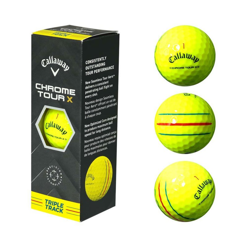 手応えのある打感とスピン性能。競技志向のプレーヤーに。『CHROME TOUR X』 飛び、スピン、フィーリング。より万能性を高めて、新たな名称に。 飛距離性能とグリーン周りでのコントロール性能を、バランス良く、ハイレベルで備えたCHROME SOFT Xボールが、名前を「CHROME TOUR Xボール」に変えて、さらにパフォーマンスアップを果たしました。新しいハイパー・ファストソフト・コアは、素材の配合の再考や徹底した生産管理により、プロや上級者が望む打感を従来以上に突き詰めつつ、ロングショットでの高いボールスピードを実現。弾道の頂点から落ち際までを徹底的に分析して生まれた、モデル別専用設計のシームレス・ツアーエアロも、ビッグキャリーで大きな飛びに貢献しています。新たにハイパフォーマンス・ツアーウレタンソフトカバーと名づけられたカバーは、より柔らかくなり、ショートゲームでのスピン量も増大。プレシジョン テクノロジーへの引きつづきの投資によって厚みも均一化され、ショットごと、個体ごとの結果のバラつきも軽減されています。ラインアップはCHROME SOFTボール同様、カラーやアライメント別に計3種類です。【Features&Benefits】■CHROME SOFT Xボールの後継モデル。新たに誕生した「CHROME TOUR Xボール」は、飛距離性能とグリーン周りでのスピン性能を高い次元で両立している、プロや上級者に向けたツアークオリティのボールです。立ち位置としては、CHROME SOFT Xボールの後継モデルとなり、とてもソフトなフィーリングのなかに、ややしっかりとした手応えも伝わってくる打球感となっています。前作のCHROME SOFT Xボールとパフォーマンスを比較すると、あらゆる部分がアップグレードされており、とくにロングショットにおけるボールスピードと、アプローチにおけるスピン性能が大きく向上しています。■配合を見直し、生産管理も徹底して完成したニューコア。高いボールスピードの実現につながっている要素の1つが、新たに採用されたハイパー・ファストソフト・コアです。「CHROME TOUR Xボール」に求められるパフォーマンスに合わせて素材の配合を見直しつつ、生産管理もこれまで以上に徹底したものとなっており、より適切な化学反応を引き起こすことで、前作のCHROME SOFT Xボール以上にロングショットでのスピンが減少し、反発力も向上。同時に、ツアープロや上級者が好むフィーリングも実現しています。また、その周りに重ねられた2重のマントルも、素材の配合を刷新。よりコアの性能を引き出すものにリニューアルされています。■風に影響されず、キャリーが伸びるシームレス・ツアーエアロ。優れた飛距離性能には、空力の改善も貢献しています。キャロウェイ独自のヘックス・エアロネットワーク パターンには、前作のCHROME SOFTシリーズから、1つひとつの6角形の深さ等を改良したTour Aeroテクノロジーが採用されましたが、今回はさらにバージョンアップが施され、シームレス・ツアーエアロと名づけられました。特徴的なのは、数多く並でいる6角形のパターンのなかに、複数の円形も採用されている点です。これにより風に影響されやすい落ち際で、風に負けることなく自分の狙いたい距離を狙っていけるようになり、更にキャリーが伸びるようになりました。■新しい空力に生かされた、TOPGOLFの弾道計測システム。この空力の進化の裏には、キャロウェイ傘下のTOPGOLFが展開する弾道計測システムの存在があります。TOPGOLFのものは他の計測機器以上に、とくに最高到達点から着弾までの間のボールの状態を解析する能力に優れています。これによって研究・開発が進み、シームレス・ツアーエアロの採用につながりました。■さらなる投資で、より均一な厚みのカバーが可能に。前作のCHROME SOFTシリーズで大きなトピックだったのが、プレシジョン テクノロジーの導入でした。ボール製造の生産設備、工程を見直して大きな投資を行い、ボール内の状態を視認できる3D X線技術などを採用。高い精度で、設計どおりのボールをつくり出すことを可能にし、製品ごと、ショットごとの弾道のバラつきなども可能な限り軽減されました。もちろん、この流れは現在も続いており、プレシジョン テクノロジーにはさらなる投資がなされています。今回の「CHROME TOUR Xボール」では、カバーを成形する機械が新しくされ、さらに均一な厚みのものとすることが可能になりました。このウレタンカバーはハイパフォーマンス・ツアーウレタンソフトカバーと名づけられており、とても柔らかく、またアプローチショットなどで、より優れたスピンコントロール性能を発揮するものとなっています。もちろんこのカバーも、「CHROME TOUR Xボール」に合わせた独自の設計となっています。■カラーは2色で、アライメントも豊富にラインアップ。「CHROME TOUR Xボール」のラインアップには、ホワイト、TRIPLE TRACKバージョンのホワイトとイエローという全3種類を用意しました。※ご購入の際、ボー