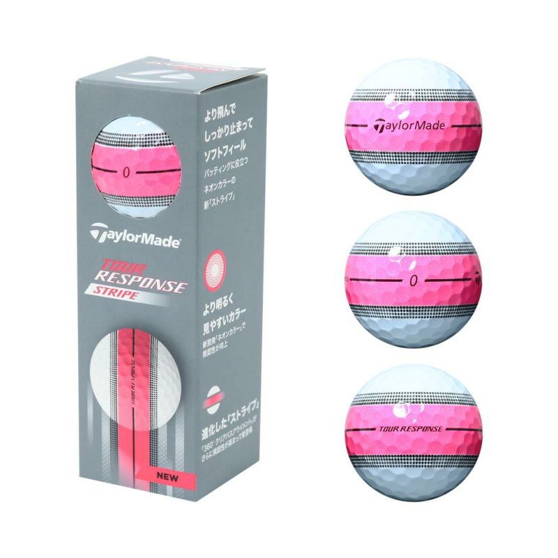 より飛んで しっかり止まって ソフトフィール。パッティングに役立つネオンカラーの新ストライプ。■どこまでも伸ばせ、このラインを。100%ウレタンカバーを使用し、『TP5』シリーズでも採用されている「スピードラップコア」を搭載した、全く新しい『ツアーレスポンス ストライプ』ボール新登場。優れたボール初速と驚くほどソフトな打感で、ティーショットの飛距離UPに貢献するだけでなく、 前作より視認性が向上したNew「360°クリアパスアライメント」によりパッティング時の構えやすさやストロークの精度向上をサポート。■テーラーメイド独自のビジュアルテクノロジー。発色性が向上し、視認性がアップした『360°クリアパスアライメント』が、あなたのプレーをより良くサポート。パッティング時の目標に対してのガイドラインはもちろん、インパクト後にも2本のラインが浮き上がることで 、ボールが真っすぐ転がっているか(順回転しているか)確認することができ、ストロークの精度向上に繋がります。■新たに「スピードラップコア」を搭載。世界のトッププロが使用する『TP5/TP5x』シリーズにも搭載され、、圧倒的なボール初速を提供する「スピードラップコア」を今作より搭載。ティーショットでの飛距離UPだけでなく、アプローチやグリーン周りで驚くほどソフトな打感を実現。■ツアーボールの性能をより身近に。ソフトな打感と圧倒的なボール初速を生む「スピードラップコア」をはじめ、「ツアーフライトディンプルパターン 」などテーラーメイドが誇るテクノロジー を集結させた3層構造。ティーショットでの低スピン・飛距離UPに貢献するだけでなく、3層目にキャストウレタンカバーを採用することで、アプローチやグリーン周りで卓越したスピン性能を発揮。※3個入りをご購入の際、ボール番号の指定はできませんのでご了承ください。