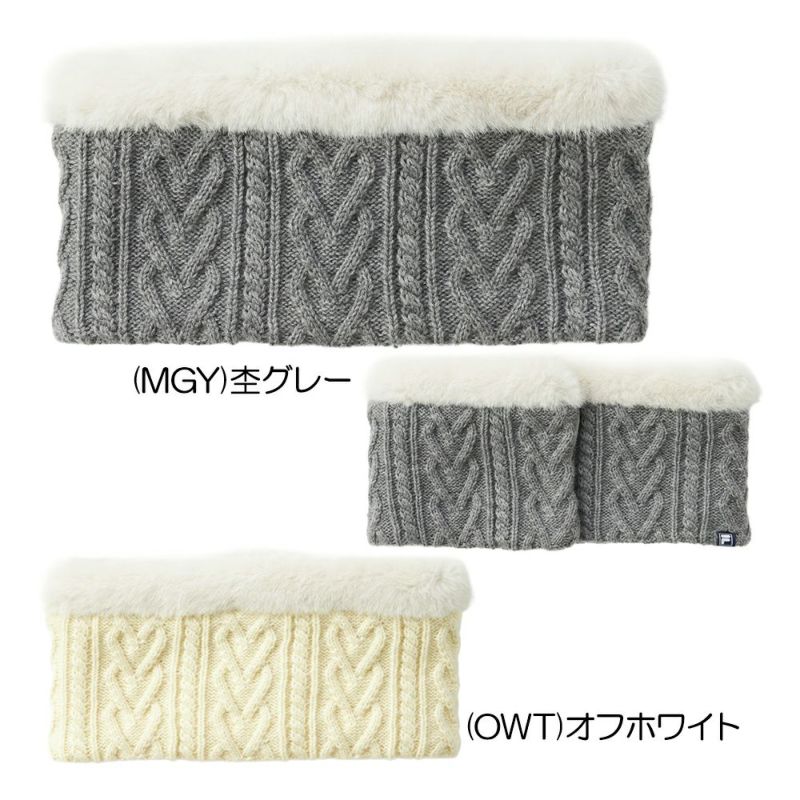 裏地がフリース素材になった、ニット素材のネックウォーマー。ハート柄のケーブル編みがデザインのポイントになっており、顔回りのエコファーが華やかさを演出します。機能性:保温。中国製。