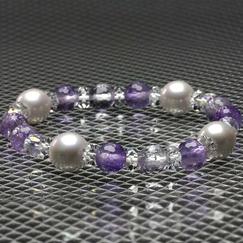 バランスeクリスタル+天然石で出来たお洒落なブレスレットです。■アメジスト 魔除けのパワーが強い石だとギリシャ・ローマ時代から言われている。浄化作用が強く、マイナスのエネルギーをプラスに変換し、自分の中にある不安やネガティブな思考を一変させていきます。 直感力や冷静な判断力、洞察力を高め、芸術的な才能を開花させたり、表現力を向上させたり、隠れた美しさや魅力、能力、才能を引き出す力がある。また、人を見抜く目を与えてくれるので、良い異性との出会い、恋愛を取り持ってくれる。※天然石を使用している為、実際の商品と写真の色合いが変わる場合がございます。