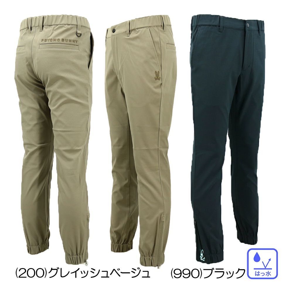 【生地】はっ水機能付きのポリエステルツイル素材の生地を使用しています。はっ水効果で突然の雨や露、汚れから生地を守ります。【デザイン】無地系のシンプルなパンツ。裾にゴムの付いたジョガーパンツシルエットですが、裾のファスナーを開くとストレートタイプに変わる2WAYタイプで、ファスナーのマチには左右で異なるデザイン刺しゅうを施した遊び心溢れる仕様になっています。前左ポケットと右後ろポケット部分に、立体的なロゴをアップリケ。リモコンやポーチを掛けられるブランドネーム入りDカンを取り付けるなど、おしゃれさとプレー時の快適さを追求しました。ゴルフシーンにはもちろん、普段使いやジム通いにも使いやすいデザインです。中国製。
