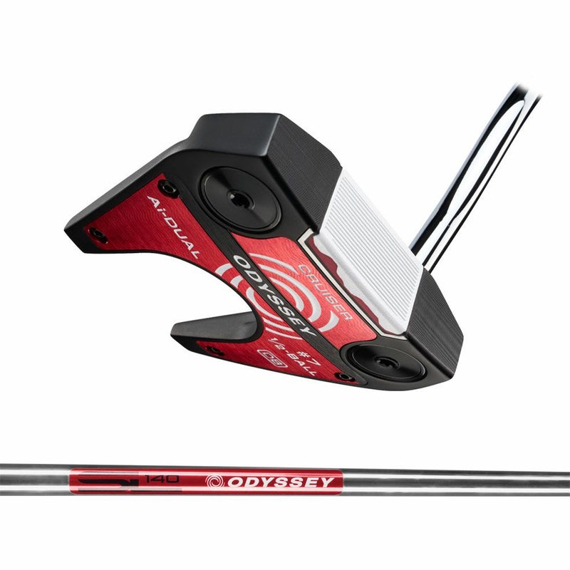 オデッセイの円を活用したアライメントに、全く新しいタイプが誕生です。新登場の「Ai-DUAL ハーフ BALL パター」では、2-BALLのように複数を並べたりするのではなく、逆にボール1個をカットして半分に。中央に入れられた黒い線も含めた曲線と直線の組み合わせが効果を発揮して、アドレス時にはボールのラインやターゲットに対するフェースのズレを簡単に認識できます。■半円が直線と曲線でできていることによる大きな効果:「Ai-DUAL ハーフBALL パター」は、構えた瞬間、他のモデルとの違いを感じることができます。その理由は、ヘッド上面の前方に描かれた、名前のとおりの半分のボール。オデッセイが新たに投入したアライメントです。半円で、前側が直線、後ろが曲線になっていることもあり、完全な円以上に構えた際のフェース面とボールのズレを感じやすく、中央に入れられたアライメントラインとボールのアライメントを合わせるように利用すれば、さらに正確なセットアップが可能となります。■ボールを打つ表面は柔らかく内側は硬い、2種類のウレタン樹脂:「Ai-DUAL・インサート」は、名前にAiの文字があることからわかるように、AIがインサートの設計を行っています。ただし、Ai-ONE・インサートやAi-ONEチタン・インサートとは違い、ウレタン樹脂のみでつくられており、ボールを打つ表面に柔らかい樹脂、内側に硬い樹脂という2層構造となっています。■ボールスピードの安定性だけでなく、より多くのフォワードスピンを生み出すインサート:Ai-DUAL・インサートでは、2層の樹脂の境目部分がAi-ONE・インサートの裏側のように複雑に曲がりくねった形状となっています。これは、どこで打ってもボールスピードが安定するAi-ONE・インサートのような性能はもちろんのこと、ボールに与えられる回転にも着目してAIが開発したものです。。Ai-DUAL・インサートは、フェースの上側や下側など、ヒットした場所に関わらず、安定してフォーワードスピン(順回転)がかかるように設計されています。■二等辺三角形のような断面の溝も、フォワードスピンによる転がりの良さに貢献:Ai-DUALインサートでは、新たに採用された溝、F.R.D(ForwardRollDesign)グルーブも転がりの良さに貢献しています。■よりWHITEHOTインサートに近い打感・打音を実現:「Ai-DUAL・インサート」は、打感や打音にもさらに配慮がなされています。「Ai-DUAL・インサート」はウレタン樹脂のみでつくられているため、打感は柔らかく、Ai-ONE・インサートよりもホワイト・ホットインサートに近い打音となるように設計されてもいます。■ラインアップはCRUISERタイプで2種類。「Ai-DUAL ハーフ BALL CRUISER パター」は、数量限定でカスタム対応不可となっています。