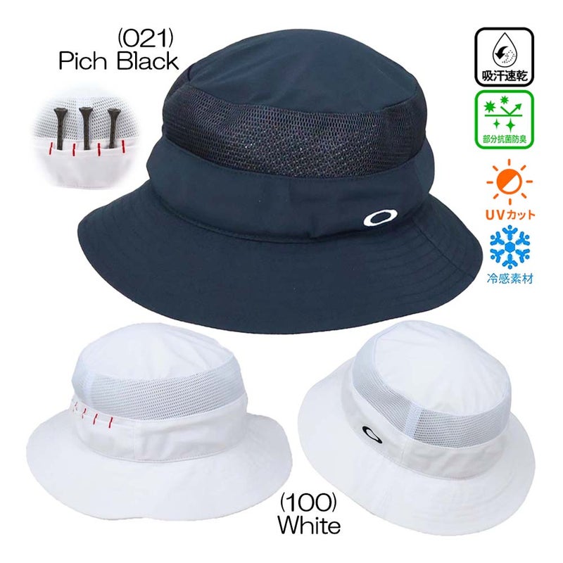 接触冷感機能に加え、紫外線から頭部を守るUPF50+、さらに優れた伸縮性を兼ね備えた高機能素材を採用したバケットハット。メッシュ素材との切り替えにより通気性が高く、濡れを素早く排出し、真夏でも快適な着用感を実現します。サイドには、オリジナルで設計されたゴルフ用ティーを挿せるループを装備し、同素材のティーが3本付属。ラウンド中の持ち運びの手間を省ける実用性も魅力です。さらに、サイズ調整が可能な汗止め部分には、吸汗速乾性・抗菌防臭性・冷感加工を施したハイブリッド素材を使用し、機能性と快適さを両立した仕上がりです。【特長】Hydrolix(TH)/吸湿性、発散性、速乾性に優れ、涼しくドライで快適な状態を保ちます。オークリー独自のO Hydrolix(TH) モイスチャーマネジメントシステムが、パフォーマンスをサポートします。中国製。