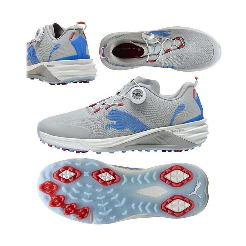 シャドウキャット ニトロ 2 ディスクは、ゴルフコースで爆発的なパワーと揺るぎない安定感を引き出すために開発された次世代スパイクレスモデルです。軽量アッパーには外側にビッグキャットロゴ、内側には【NITRO】ロゴを大胆に配し、プレー中の足元をスタイリッシュに演出。視覚的な存在感と機能美を両立するデザインに仕上がっています。立体構造のアッパーは人体工学に基づいて成形され、アシンメトリー構造がフィット感をより高めてくれるため、スイング時の安定性がさらに向上。補強アッパーと安定プレートの相乗効果により、横ブレを抑え、力の伝達をしっかりサポートします。アウトソールはトラクション配置を最適化し、接地面積を広げることでスパイクレスとは思えない優れたグリップ力を発揮。さらに、前作比約16%の軽量化に成功し(27cmで約365g)、長時間のラウンドでも疲れにくい快適性を実現しています。クッションには軽量かつ反発性に優れたNITRO FOAMを採用。歩行時のスムーズさからスイング時の踏み込みまで力強くサポートしてくれます。また、防水メッシュアッパーにより、天候が変わりやすいコースでも安心。性能・快適性・デザイン、すべてを求めるゴルファーにおすすめの一足です。幅:レギュラー丈。つま先のタイプ:ラウンドトゥ。クロージャー:ディスク。スパイクレスのアウトソール。ヒールタイプ:フラットヒール。プーマキャットのアウトソールデザイン。防水メッシュアッパー。NITRO FOAM:軽量で反発性の高いクッショニングを実現するNITRO FOAM。