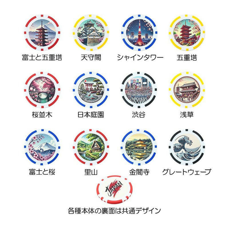 美しい日本の風景や人気スポットなどを、あのポーカーチップ・マーカーにデザイン。土産にも最適。ポーカーチップマーカーはポケットの中で探しやすくグリーン上でも目立ちます。スチール製の鉄板が入っているので磁石付きのクリップに付きます。コンペの景品やプレゼントにもおススメです。