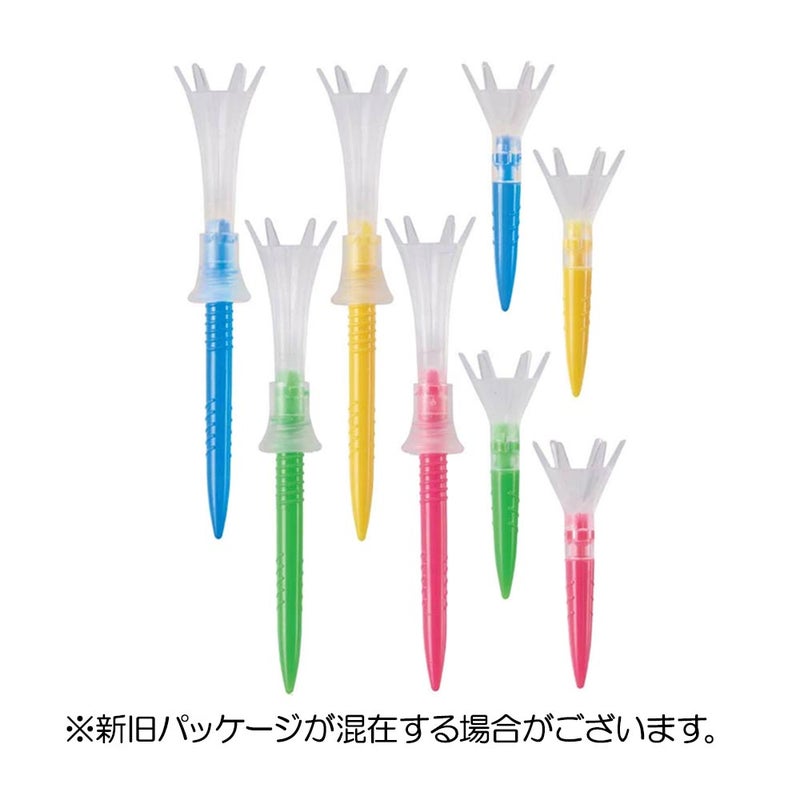 上下にネジって約10mm間で、自分好みの高さに微調節できるゴルフティー。首振りするので、インパクトでの抵抗が少なく振り抜きやすくなっています。●点で支える柔らかヘッドで抵抗を軽減。上部が王冠状になっており、6ヵ所の点でボールを支えます。ヘッド部分は柔らかい素材を使用し、インパクト時の抵抗が軽減されるので、振り抜きがよくなります。●ティーショット後のティーが探しやすい。ティーグラウンドに挿さる下部には、リブが入っています。リブが入っていることで、ティーショット時に、ティーが抜けにくくなっているのでティーを探しやすい設計になっています。●ゴルフ規則に適合。※予告なくパッケージが変更になり、ご注文のタイミングによっては新旧パッケージが混在する場合がございます。
