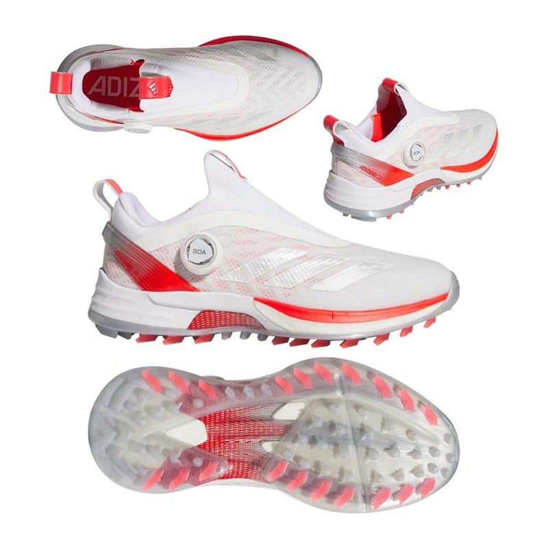 シューズ全体の構造から、スイングのエネルギーを増幅する軽量パワーギア。アグレッシブなフットワークを高次元でサポートする安定性と強いグリップ力を兼ね備え、同カテゴリーのツアーシューズと比べて約100gもの軽量化に成功。◆ アッパー ◆ 軽量で薄く、足のブレをさらに強力に制御する防水スプリントスキンアッパー。スプリントフレームやエンジニアードニットなどの異なる素材をアッパー全体にレイヤリングし、安定性とホールド力に優れたアッパー構造を採用することで重量が増えずに強く速いスイングをサポートする。 ◆ ミッドソール ◆ 超軽量で高反発なLIGHTSTRIKE PROを搭載。BOOSTと同等のクッション性能に加え、高反発性能によってスイング時に鋭い蹴りを可能にする。屈曲時の形状維持性能によって、高い推進力も誇る。ヒール周りには通常のLIGHTSTRIKEによって、さらに反発力を高めながら安定性を担保。◆ DYNAMIC TORSION PLATE ◆ スイング時のパワーを増幅する足裏の特殊パーツ。中足部アーチをホールドし、トルクコントロールをつま先までもたらすことでエネルギーロスを軽減。3本のブレードがLIGHTSTRIKE PROに接着され、相乗効果で推進力を高めることで、鋭い蹴りを可能にしながら歩行時の疲労を軽減。 ◆ スパイクモアアウトソール ◆ スパイクとスパイクレスの長所を併せ持ち、歩行時とスイング時の性能を自動的に切り替わるテクノロジーがさらに進化。屈曲する外周のアームにより、軽快な歩行と驚異的なグリップ力を両立。中心部の特殊なラグ形状でダイナミックなフットワークを高次元でサポート。◆ BOA + PRIMEKNIT ◆革新的なアッパー内蔵型のクロージャー構造のサブサーフェス直足BOAラップを搭載。高伸縮素材のPRIMEKNITが足の形状に順応し、フィット感と通気性を向上。BOAのレースとパネルも内蔵され、ブレを抑えてアグレッシブなスイングをサポート。BOAパネルにもシークエンスレーシングとTRI-WRAP構造を採用し、安定性と順応性が大きく向上。