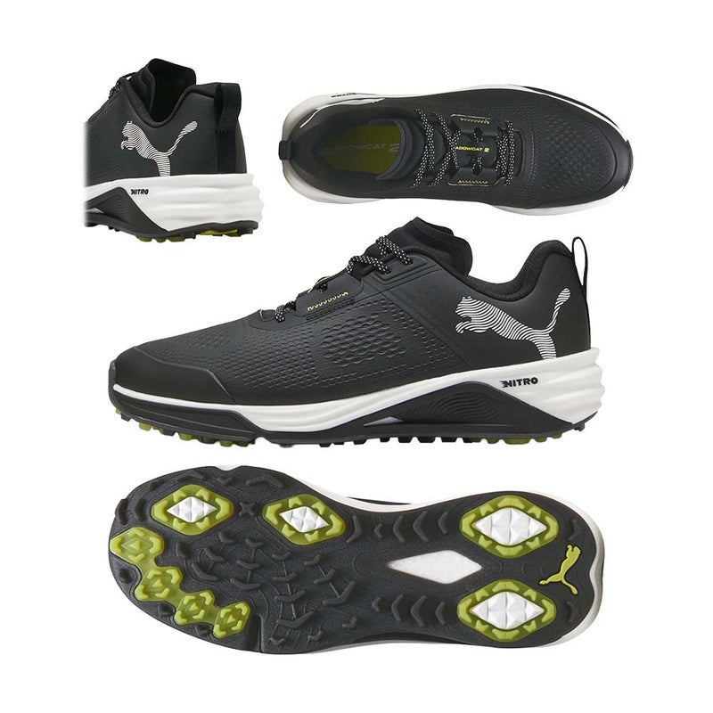 ゴルフコースでの爆発的なパワーと安定したパフォーマンスを引き出すために設計された、シャドウキャット ニトロ 2。軽量アッパーに大胆なビッグキャットロゴ、内側には“NITRO”ロゴを配し、プレー中も存在感を放つスタイリッシュなデザインが魅力です。足の形に沿うように人体工学に基づいて成形された立体的アッパーと、アシンメトリー構造が高いフィット感を実現。スイング時の横ブレを抑える補強アッパーと安定プレートの組み合わせにより、力の伝達を助け、安定したショットをサポートします。アウトソールはトラクションの配置を最適化し、接地面積を広げることでスパイクレスながら確かなグリップ力を発揮。さらに、前作比16%の軽量化(27cmで約355g)に成功し、18ホールを通して疲れにくい履き心地を実現しています。クッションには軽量かつ反発性に優れた NITRO FOAMを採用。歩行時の快適さからスイング時の力強い踏み込みまでサポートします。防水メッシュアッパーにより急な天候変化にも対応でき、雨の日でも安心してプレー可能。パフォーマンスと快適性を求めるゴルファーにふさわしい、次世代のスパイクレスシューズです。幅:レギュラー丈つま先のタイプ:ラウンドトゥ。クロージャー:シューレース式。スパイクレスのアウトソール。ヒールタイプ:フラットヒール重量:約355g(27cm)※前作比約16%カット。防水メッシュアッパー。NITRO FOAM:軽量で反発性の高いクッショニングを実現するNITRO FOAM。プーマキャットのアウトソールデザイン。