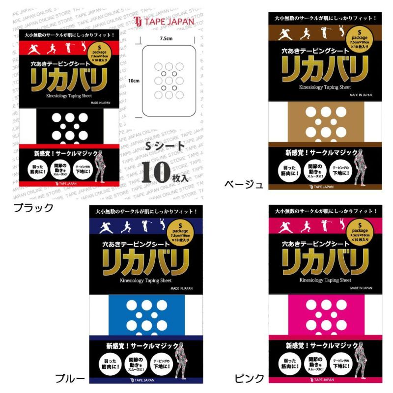 テープに施された大小無数の穴が通常の伸縮性テープには無い、バリエーションに富んだ刺激を皮膚感覚に与えます。 今までにない新感覚のテーピングシートです。(小さな部位向き)。 ●「POINT1」リカバリーサークルが様々なサポート機能を高める。・テープに施された大小の穴が通常の伸縮性テープには無い、バリエーションに富んだ刺激を皮膚感覚に与えます。・ユーザーのあらゆる動きに対し、大小無数のリカバリーサークルがスムーズに連動して、その動きをサポートします。●「POINT2」効果的なシワが簡単にできます。・テープをそのまま貼るだけでも、効果的なシワが簡単にできます。・特にリカバリーサークルの大きな穴の部分は「皮膚をつまんで持ち上げる」効果もあり、新陳代謝をサポートします。 ●「POINT3」優れた通気性を実現。長時間使用でもカブレにくい設計。リカバリーサークルにより同サイズの伸縮性テープの通気性に比べ、+約16%の通気性を確保。(※リカバリMサイズの場合)。 ●「POINT4」水に濡れても安心の撥水加工。リカバリシート表面には撥水加工が施されています。急な雨や入浴等にも剥がれること無く、しっかりサポートいたします。・使用前は肌の汗や汚れをしっかりとふき取ってから使用してください。