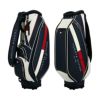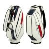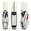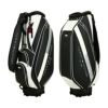 カートタイプのキャディバッグ。シンプルな造りに軽量シボ合皮を使用している為、軽く、持ち運びの時に負担が軽減され快適にお使いいただけます。ブランドイメージを落とし込んだベーシックなアイテムです。ポケット6個。口枠5分割。セパレーター3分割。