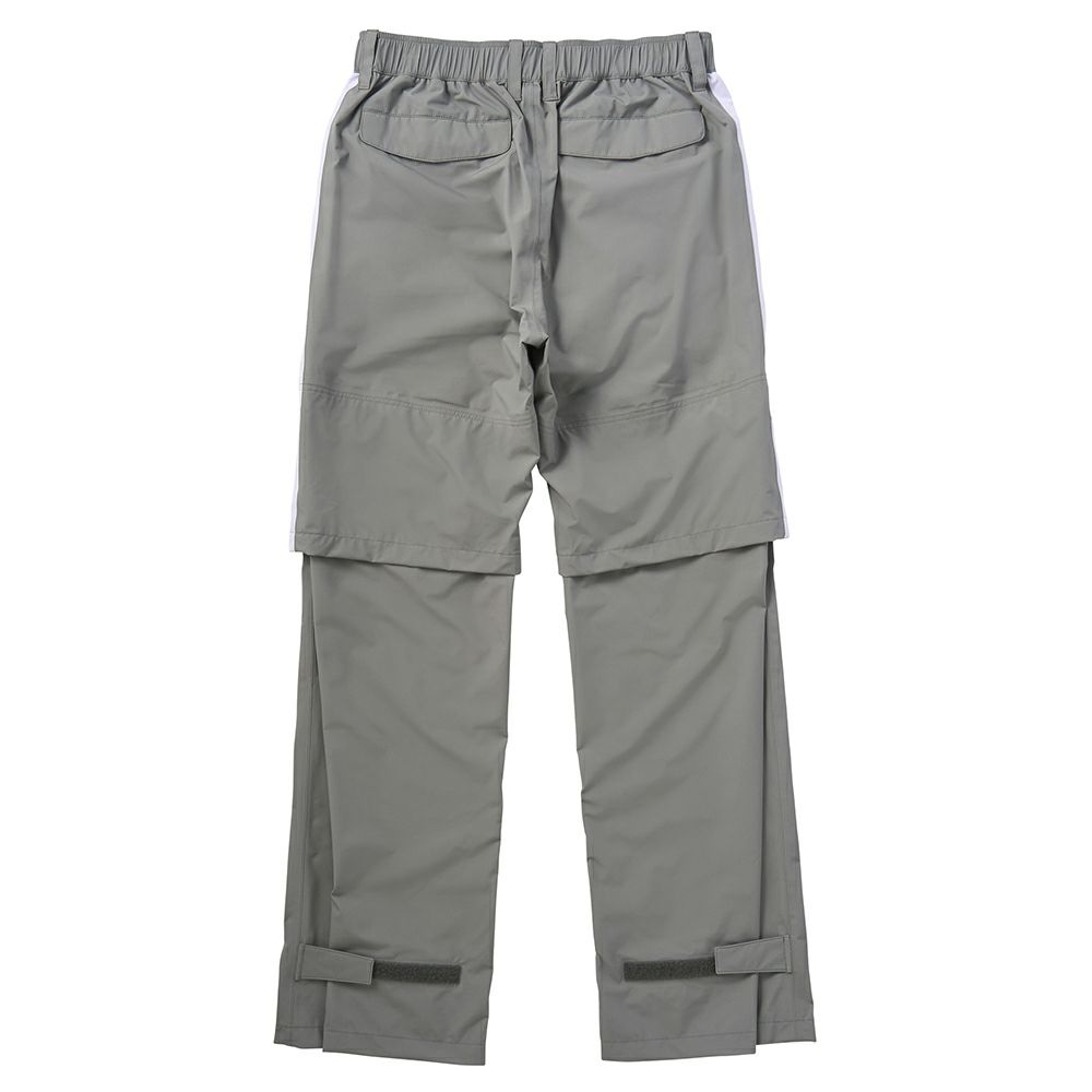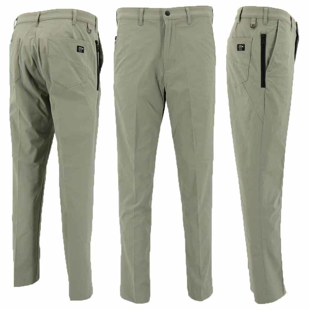 【生地】はっ水機能付きのポリエステルツイル素材の生地を使用しています。はっ水効果で突然の雨や露、汚れから生地を守ります。【デザイン】無地系のシンプルなパンツ。裾にゴムの付いたジョガーパンツシルエットですが、裾のファスナーを開くとストレートタイプに変わる2WAYタイプで、ファスナーのマチには左右で異なるデザイン刺しゅうを施した遊び心溢れる仕様になっています。前左ポケットと右後ろポケット部分に、立体的なロゴをアップリケ。リモコンやポーチを掛けられるブランドネーム入りDカンを取り付けるなど、おしゃれさとプレー時の快適さを追求しました。ゴルフシーンにはもちろん、普段使いやジム通いにも使いやすいデザインです。中国製。